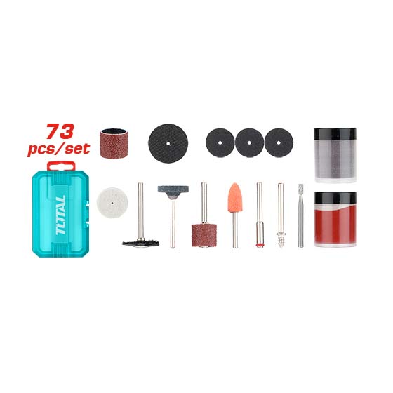 Bộ 73 linh kiện đa năng gồm: 4 miếng mài, 2 mũi mài, 1 bàn chải nylon, 2 trục, 1 lưỡi cắt tốc độ cao, 1 đĩa mài bóng, 1 đĩa cắt cốt thép, 1 bánh mài bóng, 36 đĩa cắt, 20 đĩa chà nhám và 1 trống chà nhám có trục