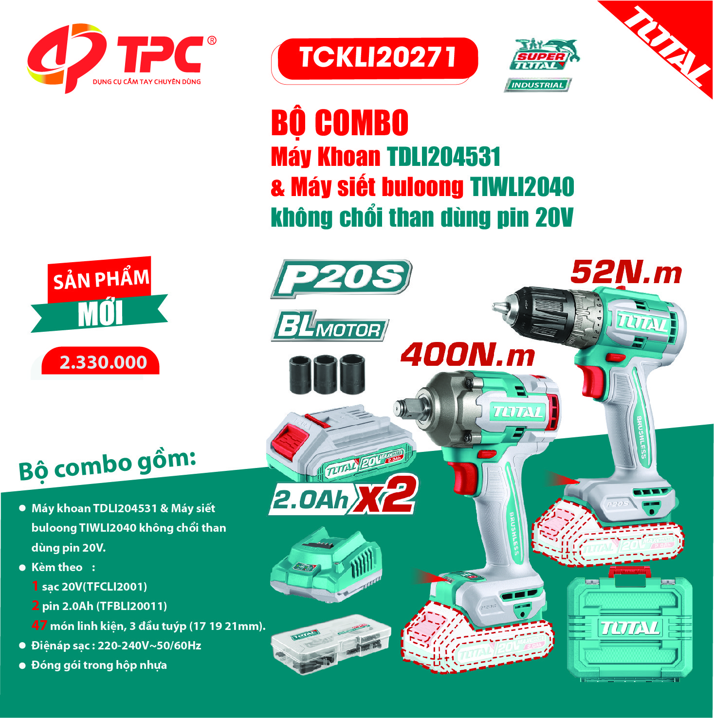 - Bộ combo máy khoan TDLI204531 & máy siết buloong TIWLI2040 không chổi than dùng pin 20V TOTAL - TCKLI20271 chính hãng giá tốt kèm nhiều quà tặng hấp dẫn tại Bigtools Việt Nam. Bảo hành chính hãng. Giao hàng nhanh tận nơi. Tư vấn chính xác. Hotline: 0938.6