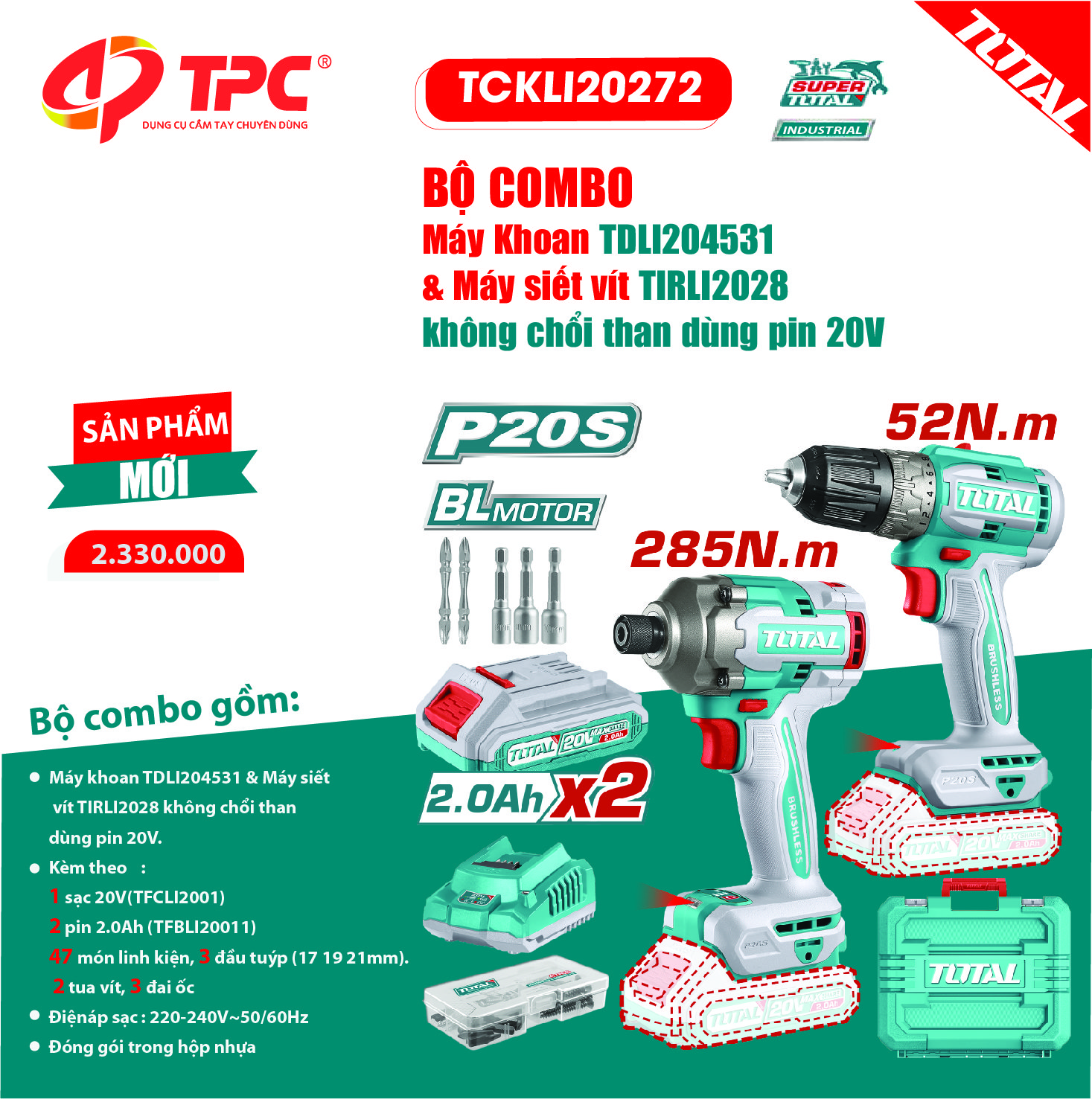 - Bộ combo máy khoan TDLI204531 & máy siết vít TIRLI2028 không chổi than dùng pin 20V TOTAL - TCKLI20272 chính hãng giá tốt kèm nhiều quà tặng hấp dẫn tại Bigtools Việt Nam. Bảo hành chính hãng. Giao hàng nhanh tận nơi. Tư vấn chính xác. Hotline: 0938.689.5