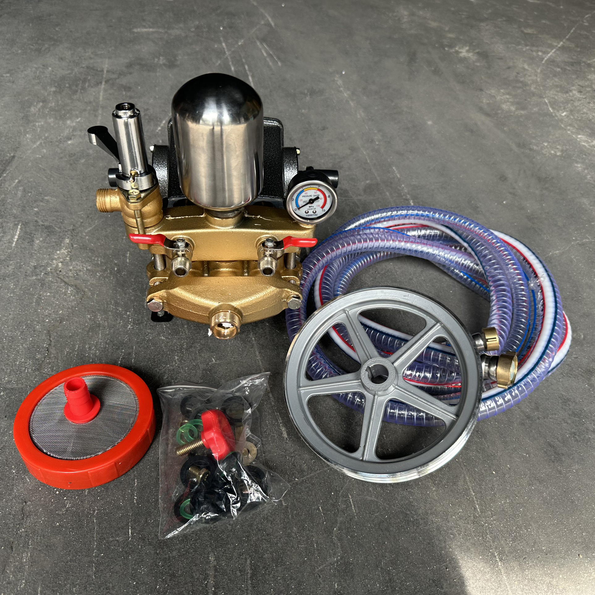 Thiết bị đầu xịt áp lực bao gồm 3 bộ phận chính: Trục quay, động cơ và piston. Trong đó, trục quay đóng vai trò kết nối đầu máy với motor thông qua dây curoa để tạo thành máy rửa xe dây đai hoàn chỉnh; động cơ của đầu máy là bộ phận giúp thiết bị hoạt động còn piston sẽ đảm nhận nhiệm vụ đẩy và phun xịt nước ra bên ngoài. Kết nối với đầu xịt áp lực là các phụ kiện khác như dây rửa, dây hút nước, dây hồi, đầu lọc nước,...