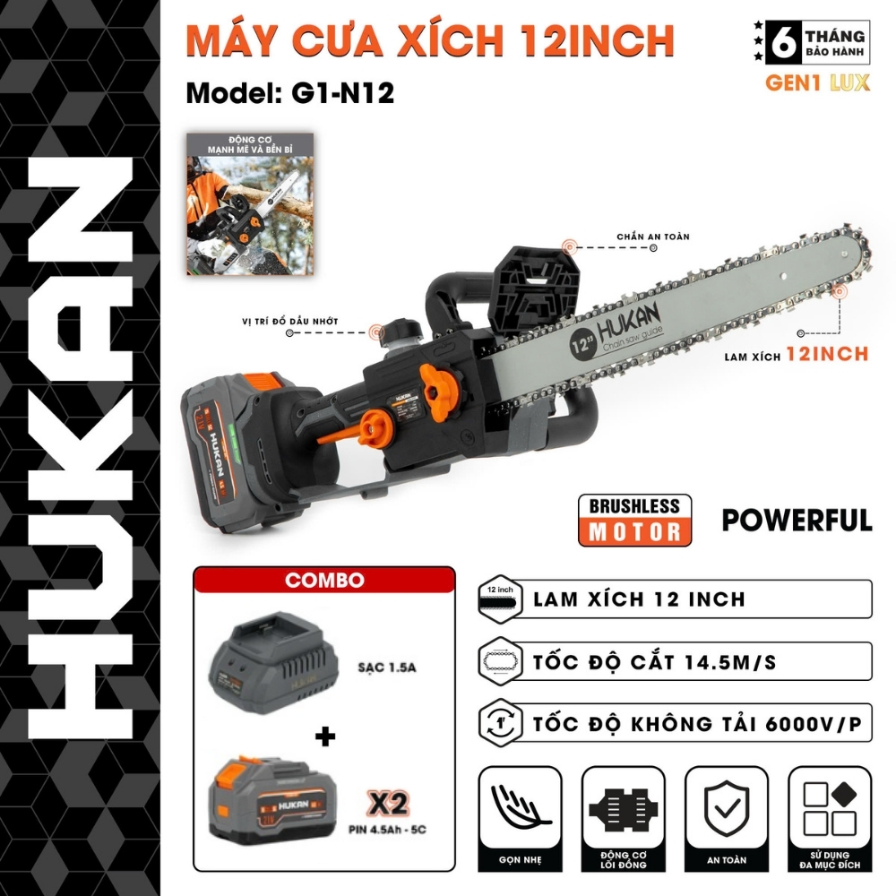 G1-N12 thuộc dòng Luxury cao cấp của Hukan, được chế tạo để phục vụ những công việc nặng nhọc. Máy không chỉ gây ấn tượng bởi vẻ ngoài hầm hố, chắc chắn mà còn nhờ khả năng vận hành bền bỉ. Lam xích dài giúp mở rộng phạm vi cắt, biến những thân cây lớn trở nên dễ dàng xử lý hơn bao giờ hết, là trợ thủ đắc lực cho các trang trại, xưởng mộc và đội ngũ chăm sóc cây xanh đô thị.