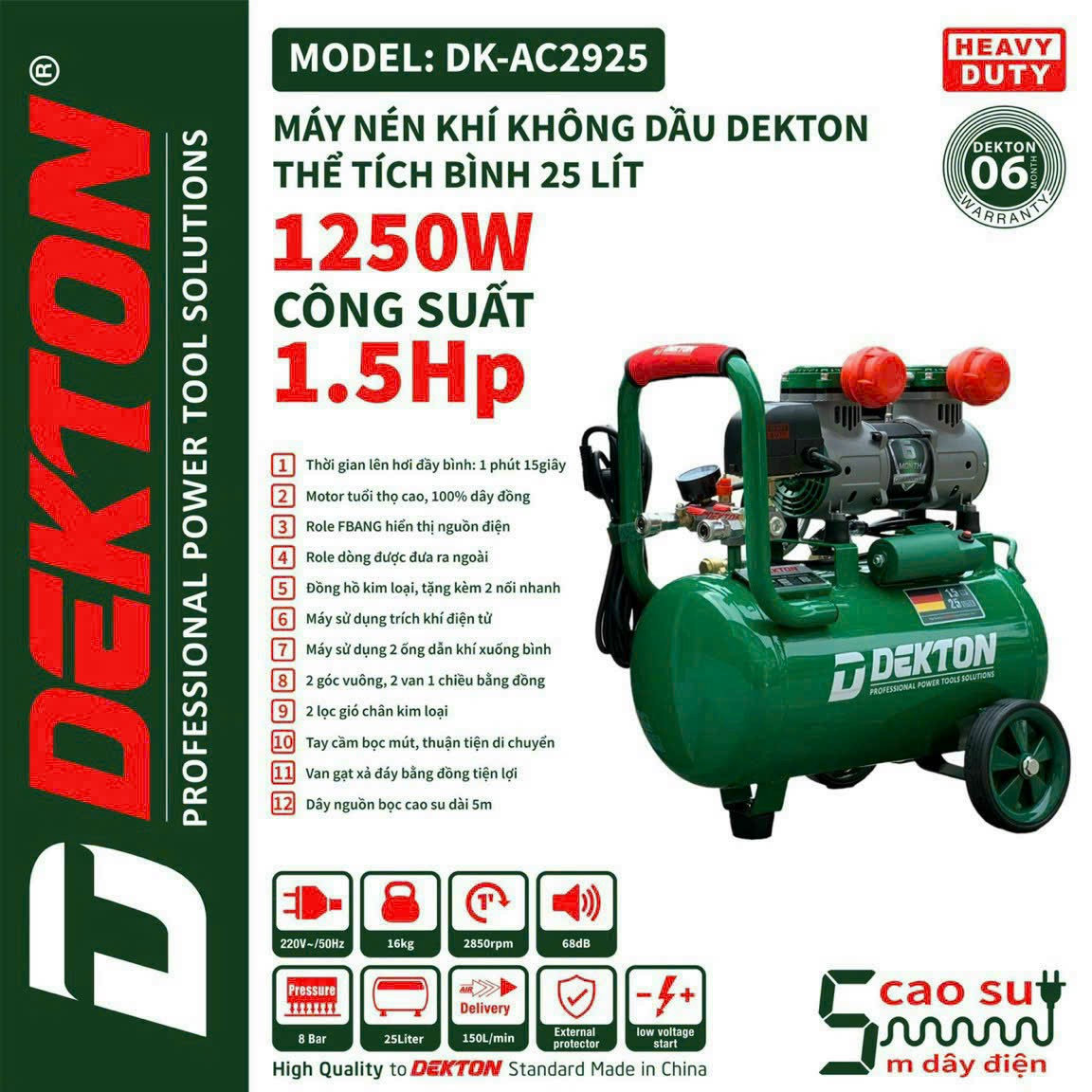 - Máy nén khí không dầu DEKTON DK-AC2925 chính hãng giá tốt kèm nhiều quà tặng hấp dẫn tại Bigtools Việt Nam. Bảo hành chính hãng. Giao hàng nhanh tận nơi. Tư vấn chính xác. Hotline: 0938.689.525 - 0933.253.369