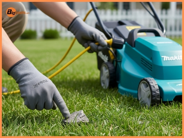 - Chuẩn bị khu vực làm việc: Dọn dẹp sân vườn, loại bỏ các vật cản như đá, cành cây, đồ chơi trẻ em có thể bị lưỡi cắt văng ra gây nguy hiểm.